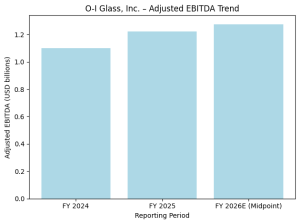 For full-year 2025, O-I Glass reported net sales of $6.43 billion, broadly stable compared with $6.53 billion in 2024. Despite relatively flat volumes, profitability improved meaningfully. Adjusted EBITDA rose to $1.22 billion from $1.10 billion in the prior year, lifting the adjusted EBITDA margin to 19.0% from 16.8%.