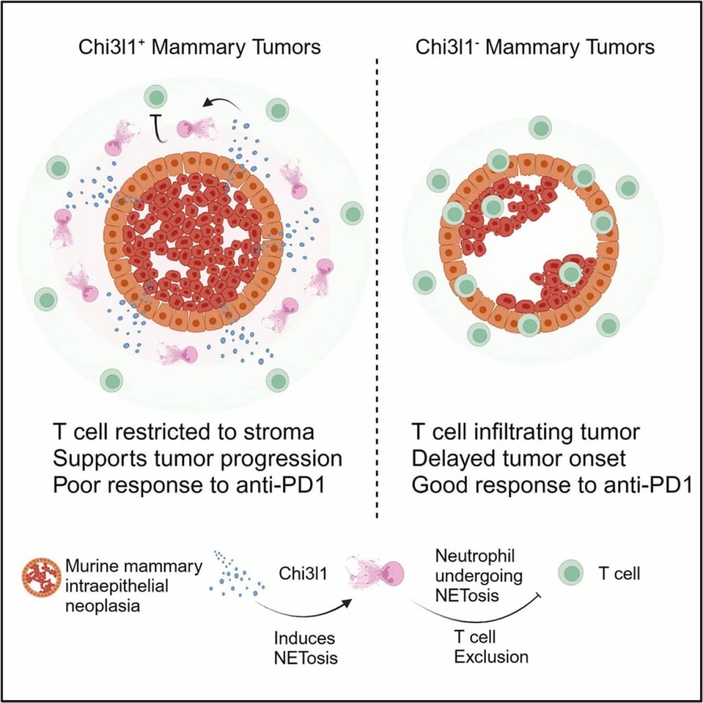 The groundbreaking discoveries by a team led by Dr. William Muller at McGill University and in collaboration with Dr. Elias demonstrate that CHI3L1 stimulates neutrophil elaboration of NETs which block T-cells from contacting and killing the breast cancer tumor. The study also provides further evidence of the potential impact of the company’s anti-Chi3L1 antibody in reversing this process and suppressing breast cancer tumor growth.