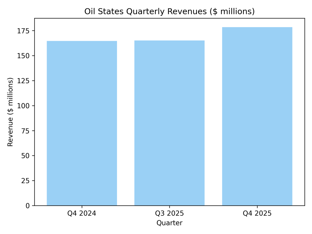 Oil States International, Inc. (NYSE: OIS) reported fourth-quarter results for the period ended December 31, 2025. The company posted consolidated revenues of $178.5 million and a net loss of $117.2 million, which included one-time asset impairment and restructuring charges. Adjusted EBITDA for the quarter was $22.8 million. Market capitalization: $371.6 million.