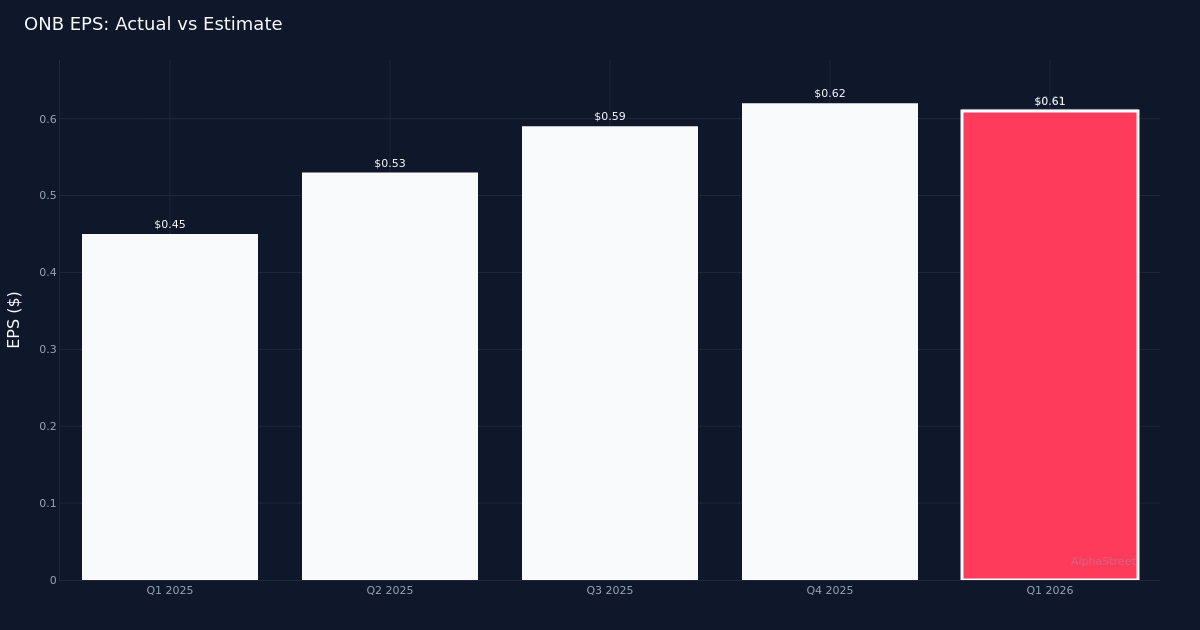 In-Line Performance. Old National Bancorp (NASDAQ:ONB) delivered Q1 2026 adjusted EPS of $0.61, meeting analyst expectations of $0.61, though shares retreated 2.0% to $23.77 as investors digested the results. The regional bank generated $694.9M in revenue for the quarter, marking a substantial 44.6% increase from the $480.4M recorded in Q1 2025. Net income reached $237.7M for the quarter, underscoring solid profitability despite a challenging environment for regional banks navigating interest rate dynamics and competitive deposit pressures.
