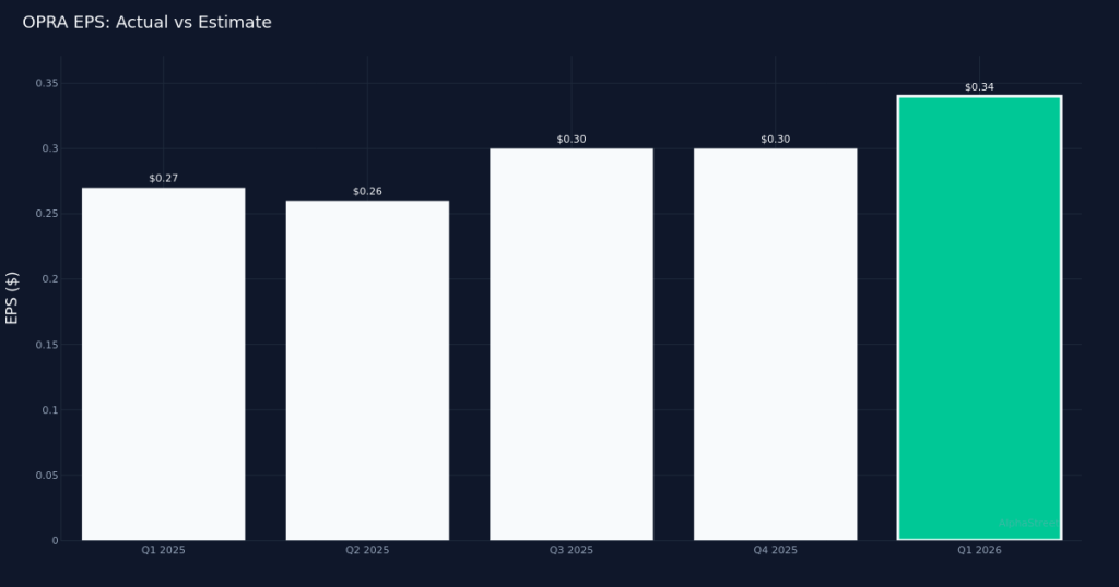 OPRA|EPS $0.34 vs $0.33 est (+3.0%)|Rev $175.8M|Net Income $24.8MOpera Limited reported first-quarter results that exceeded Wall Street expectations, with adjusted diluted earnings of $0.34 per share beating the $0.33 consensus estimate by 3.0%. The browser and digital services company generated $175.8M in revenue for the quarter, up 23.0% from $142.7M in Q1 2025, while adjusted net income reached $31.2M.