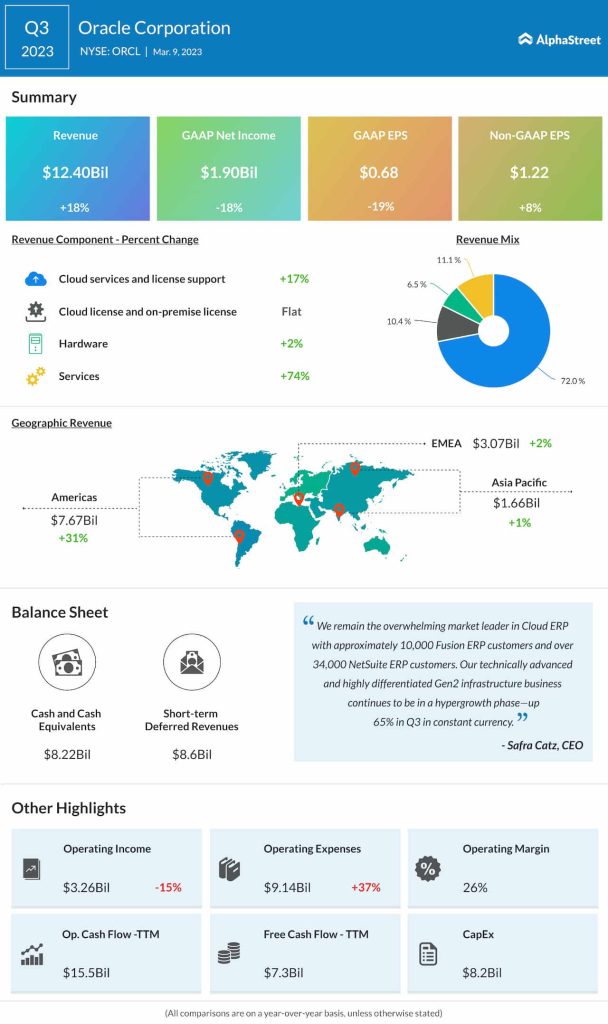 At $12.4 billion, revenues were up 18% year-over-year in the third quarter of fiscal 2023. Cloud services and license support revenues were up 17%
