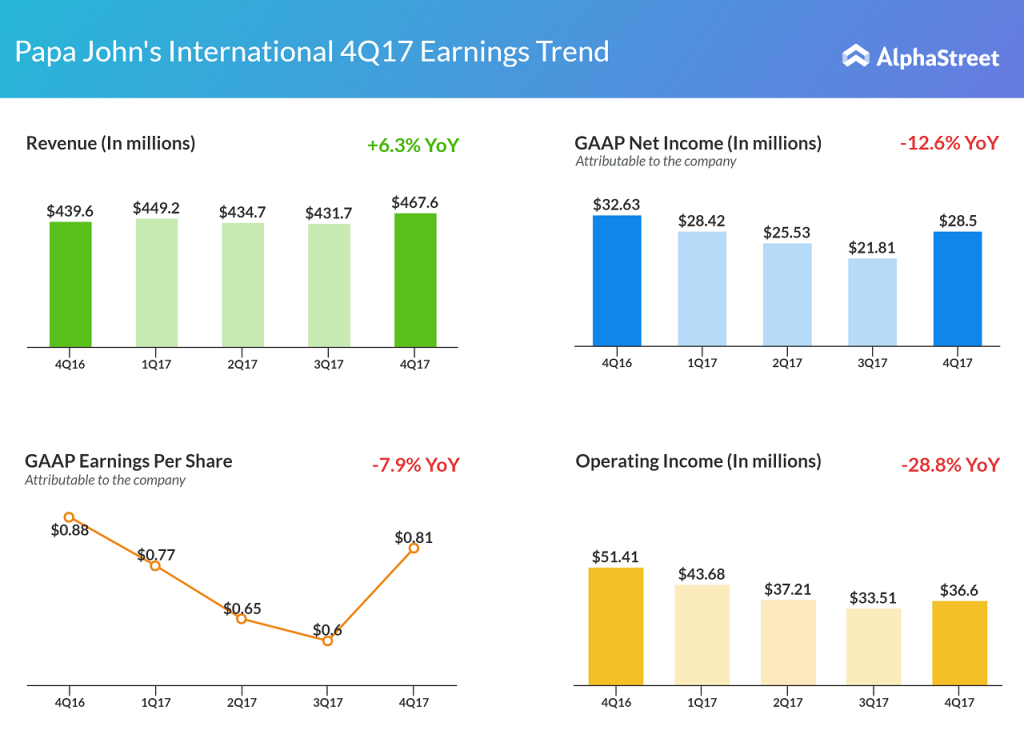 For 2018, Papa John expects diluted earnings per share in the range of $2.40 to $2.60 compared to $2.83 reported in fiscal 2017.
