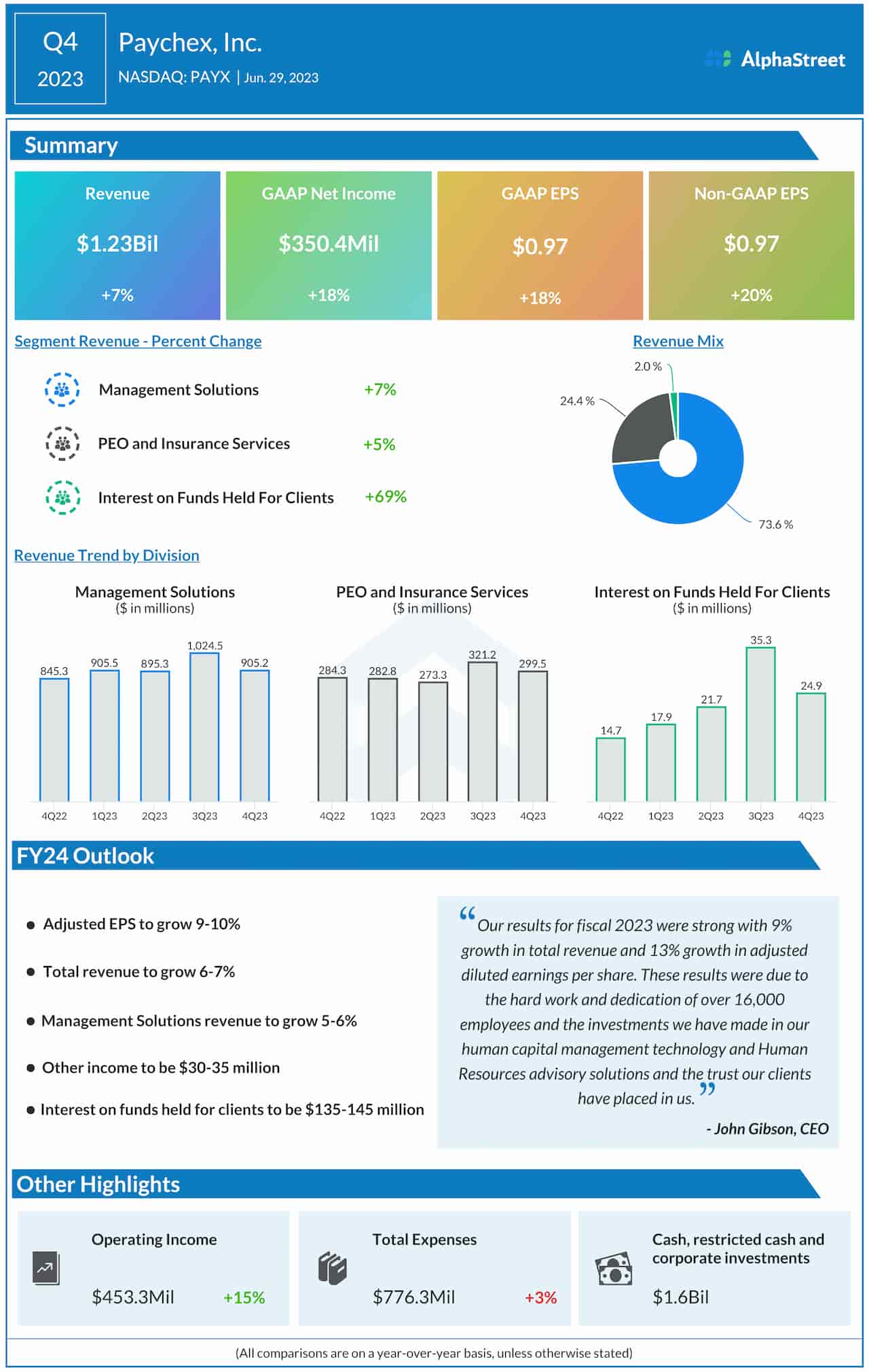 Paychex Inc. (NASDAQ: PAYX) on Thursday said its earnings increased year-over-year in the fourth quarter of 2023, helped by strong revenue growth. The company also provided guidance for fiscal 2024.