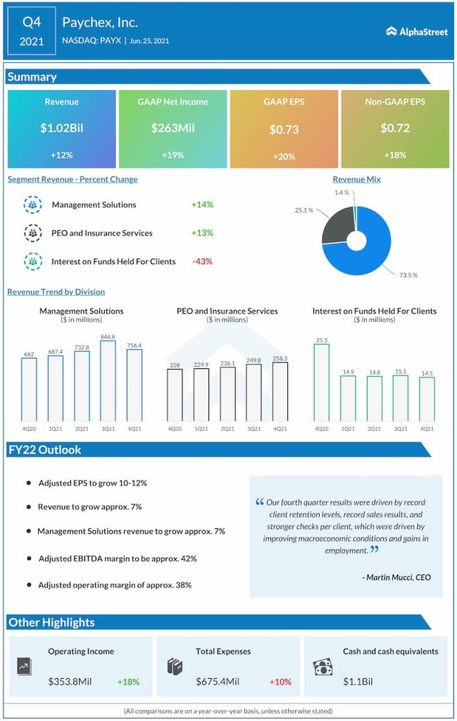 Paychex, Inc. (NASDAQ: PAYX) reported fourth quarter 2021 earnings results today.