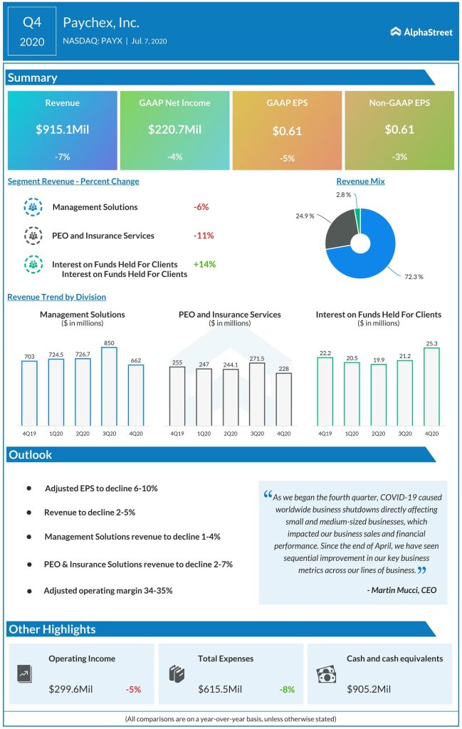 Paychex (NASDAQ: PAYX) reported fourth quarter 2020 earnings results. Adjusted earnings of $0.61 per share and revenue of $915.1 million decreased year-over-year. However, the company’s bottom and top-line results surpassed market’s view.