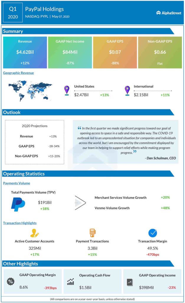 Payment service provider PayPal Holdings Inc. (NASDAQ: PYPL) reported weaker-than-expected earnings and revenues for the first quarter of 2020. The stock dropped sharply during Wednesday’s extended trading session. The company also provided guidance for the second quarter, but withdrew the full-year outlook issued earlier.