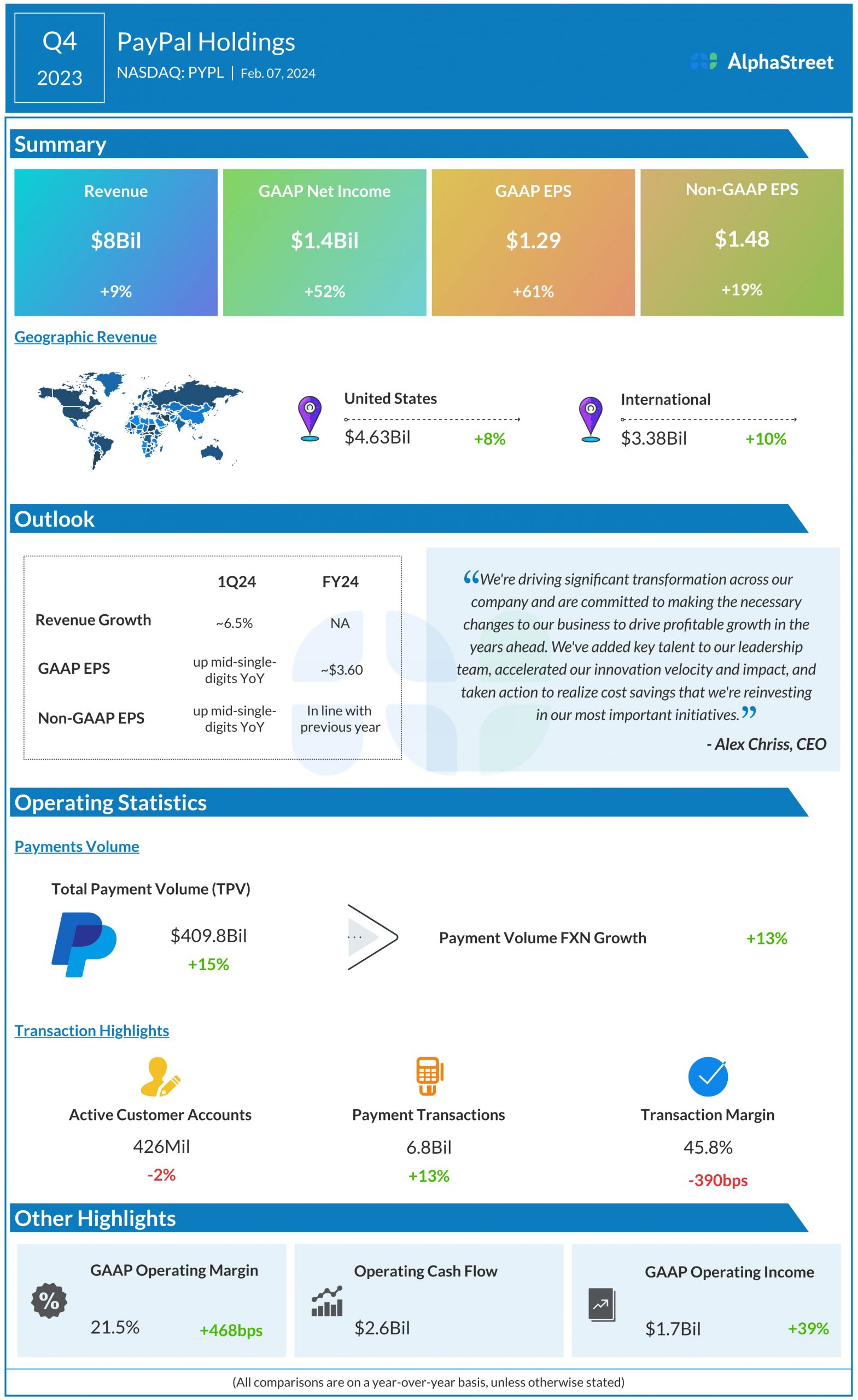 PayPal Holdings, Inc. (NASDAQ: PYPL) reported net revenues of $8 billion for the fourth quarter of 2023, up 9% on both a spot and foreign-currency neutral basis (FXN).