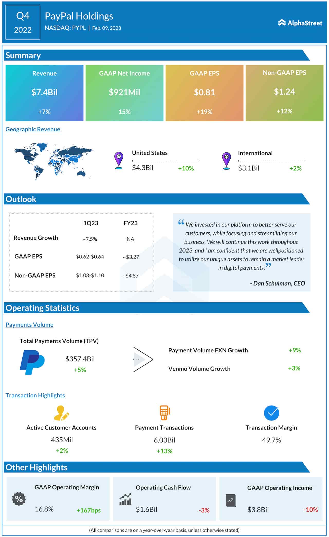 PayPal ended fiscal 2022 setting a new record – in the fourth quarter, revenues crossed $7 billion for the first time. The top line also came in above the market’s projection and was up 7% from the year-ago quarter. The broad-based revenue growth, across all regions, translated into a 12% increase in adjusted earnings to $1.24 per share. Earnings were above the management’s estimates and also topped expectations. There was a 5% growth in total payment volume, supported by a further increase in customer accounts.