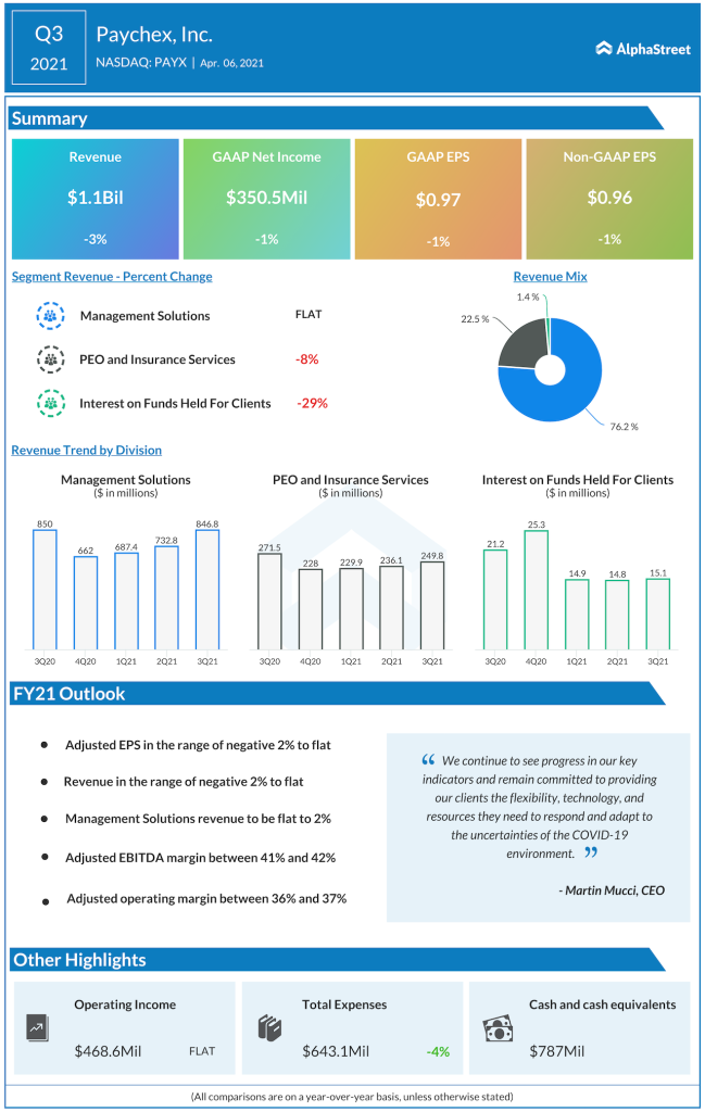 Paychex, Inc. (NASDAQ: PAYX) today reported its third-quarter financial results for the period ended February 28, 2021. Here are the key highlights from the earnings report. Subscribe to view the Paychex earnings infograph.