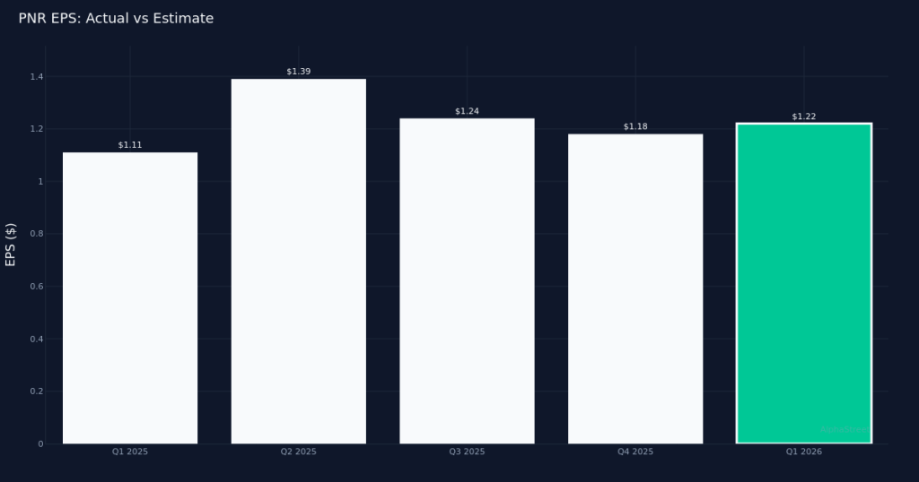 PNR|EPS $1.22 vs $1.18 est (+3.4%)|Rev $1.04B|Net Income $172.4MPentair plc reported first-quarter adjusted earnings of $1.22 per share, topping the $1.18 analyst forecast by 3.4%, as the water solutions provider navigated modest demand growth across its global footprint. Revenue totaled $1.04B for the quarter, up 3.0% from the $1.01B recorded in Q1 2025, while adjusted bottom-line profit came in at $199.0M. The company’s operations span the United States, Western Europe, China, Latin America, the Middle East, Southeast Asia, Australia, and Canada.