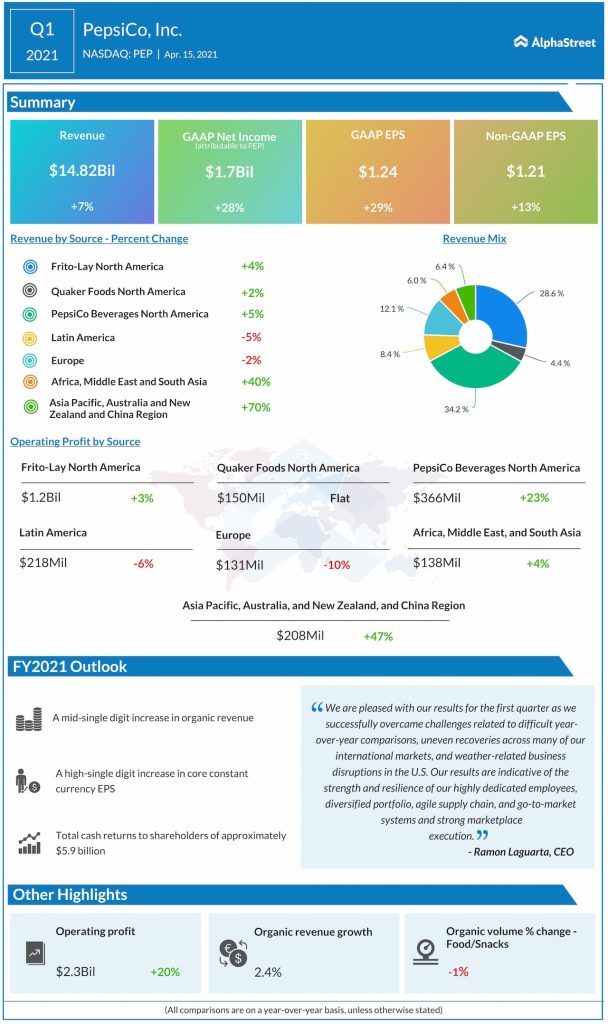 “PepsiCo Inc. (NASDAQ: PEP) reported first-quarter 2021 earnings results today. Net revenues increased 6.8% year-over-year to $14.82 billion while organic revenue growth was 2.4%. Net income attributable to PepsiCo was $1.7 billion, or $1.24 per share, compared to $1.3 billion, or $0.96 per share, last year. Core EPS amounted to $1.21 per share.