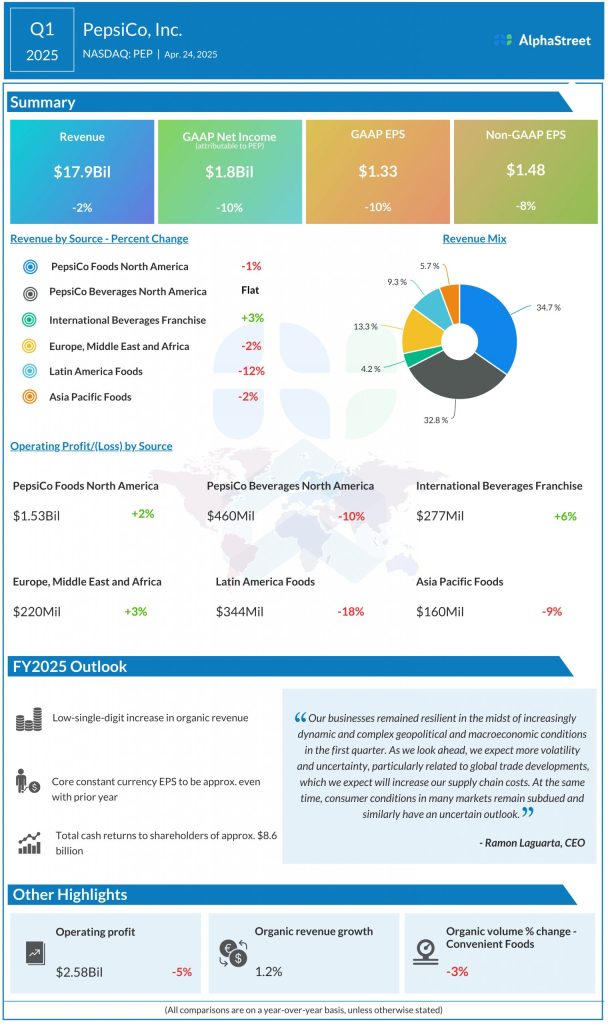 In the first three months of FY25, PepsiCo’s revenue decreased 1.8% annually to $17.9 billion, with organic revenue edging up 1.2%. Core earnings, adjusted for special items, declined 8% year-over-year to $1.48 per share. Unadjusted net income attributable to the company was $1.8 billion or $1.33 per share, compared to $2 billion or $1.48 per share a year earlier.