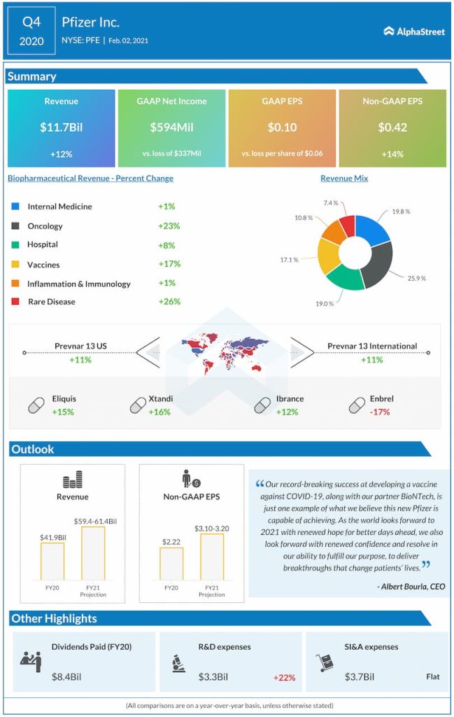 Pfizer Inc. (NYSE: PFE) reported its fourth quarter 2020 earnings results today.