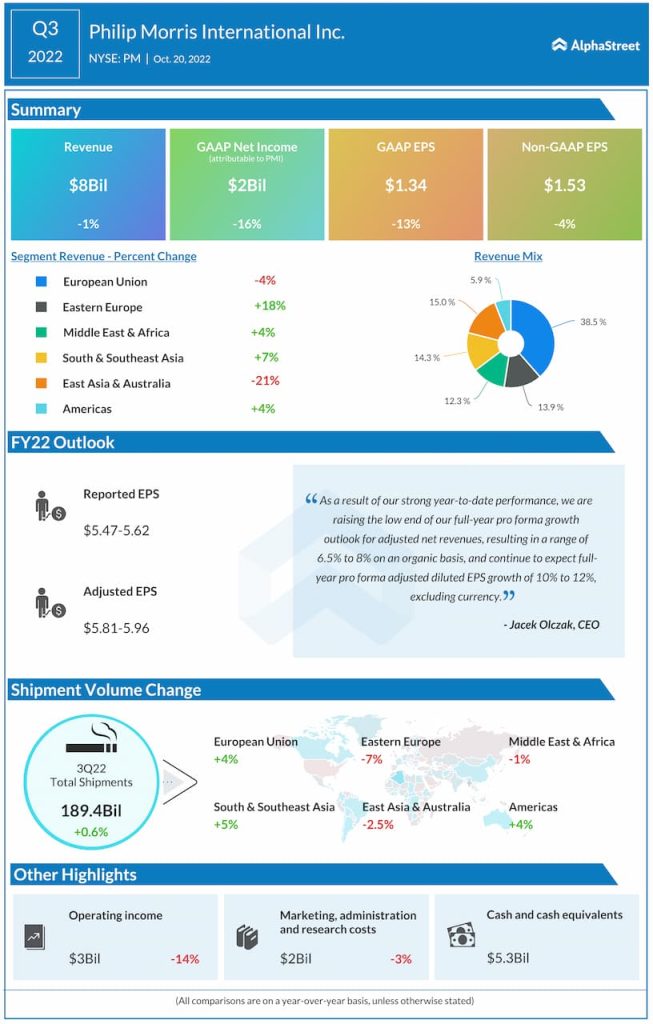 Net earnings attributable to PMI decreased to $2 billion from $2.4 billion in the year-ago period. Reported EPS was $1.34 compared to $1.55 last year. Adjusted EPS was $1.53 versus $1.59 last year.