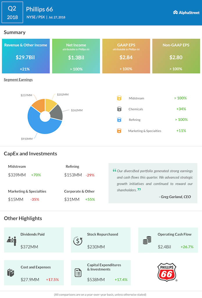 Phillips 66 (PSX) reported revenues of $29.7 billion for the second quarter of 2018, up 23% from the same period last year. Net earnings totaled $1.33 billion or $2.84 per diluted share compared to $524 million or $1.07 per diluted share in the prior-year period. Adjusted EPS was $1.32 billion or $2.80 per share.