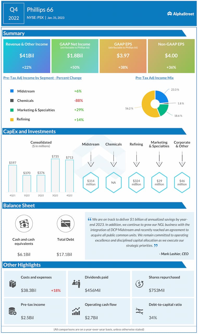 Phillips 66 (NYSE: PSX) reported total revenue and other income of $41 billion for the fourth quarter of 2022 compared to $33.5 billion in the year-ago period.