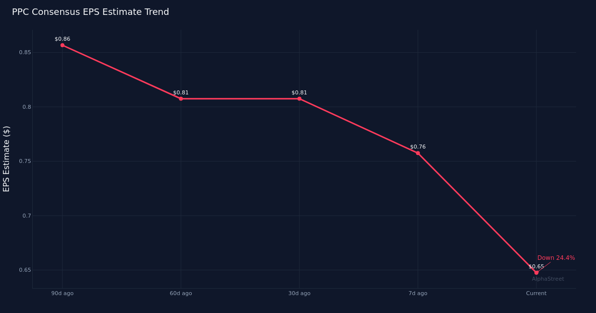 Analyst sentiment has deteriorated sharply. Estimate revisions tell a concerning story heading into the print. The consensus EPS forecast has fallen down 19.8% over the past 30 days from $0.81, while the 90-day drift shows an even steeper down 24.4% decline from $0.86. This sustained downward pressure on estimates signals that analysts have grown increasingly cautious about Pilgrim’s near-term profitability outlook, with Wall Street progressively marking down expectations as the quarter unfolded. The magnitude and consistency of these cuts suggest fundamental headwinds rather than minor adjustments.