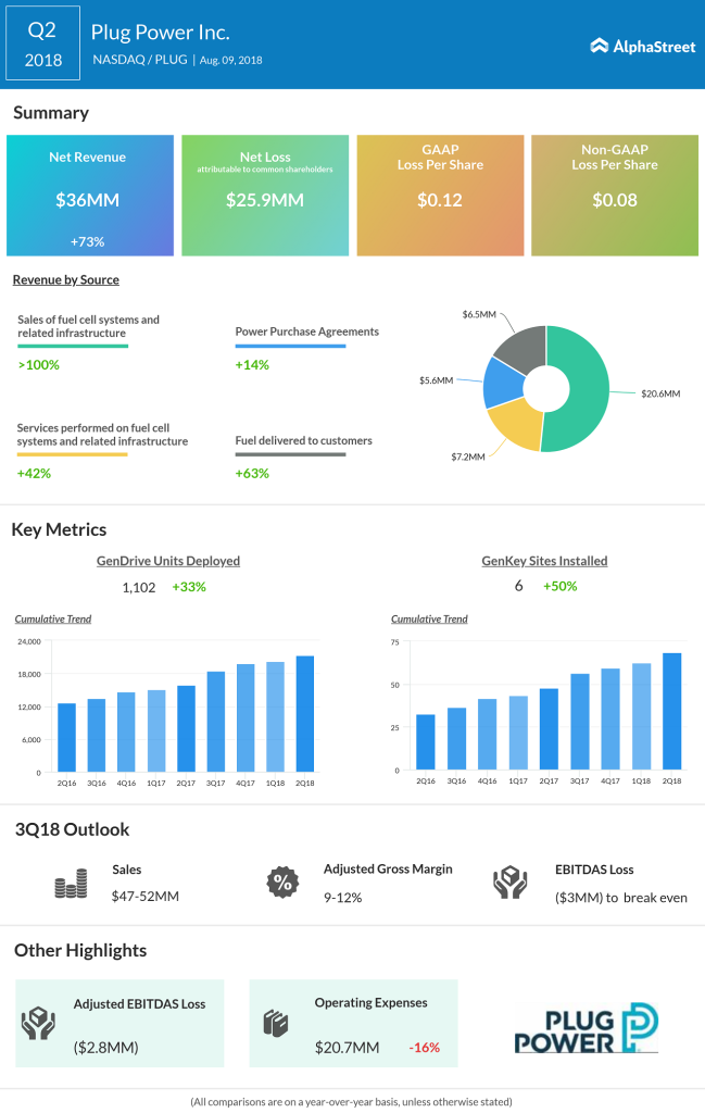During the Q2 2018, the company shipped a total of 1,102 GenDrive units compared to 830 units in the prior-year period. Six GenFuel sites were installed in the quarter versus four in the prior-year period. Plug Power had 67 sites under fuel delivery contract on June 30, 2018, versus 46 sites on June 30, 2017