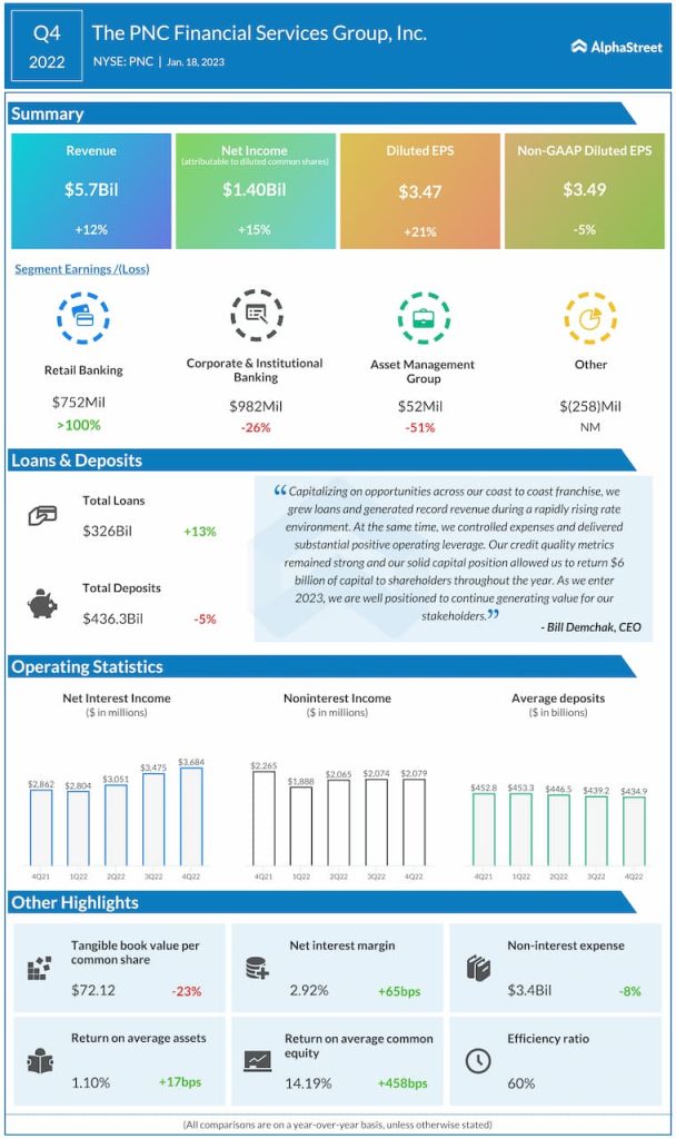 The PNC Financial Services Group, Inc. (NYSE: PNC) reported revenue of $5.7 billion for the fourth quarter of 2022, which was up 12% from the same period a year ago.