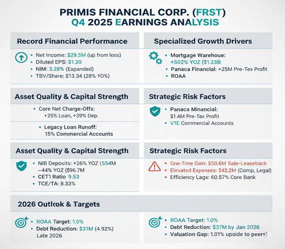 Primis Financial Corp. (NASDAQ: FRST) announced its fourth-quarter 2025 financial results, highlighted by a substantial expansion in profitability and a strengthened capital position. The McLean-based financial institution reported net income of $29.5 million, or $1.20 per diluted share, a 334% increase from the $6.8 million recorded in the preceding quarter. This performance marks a notable recovery from the $23.3 million loss reported in the fourth quarter of 2024.