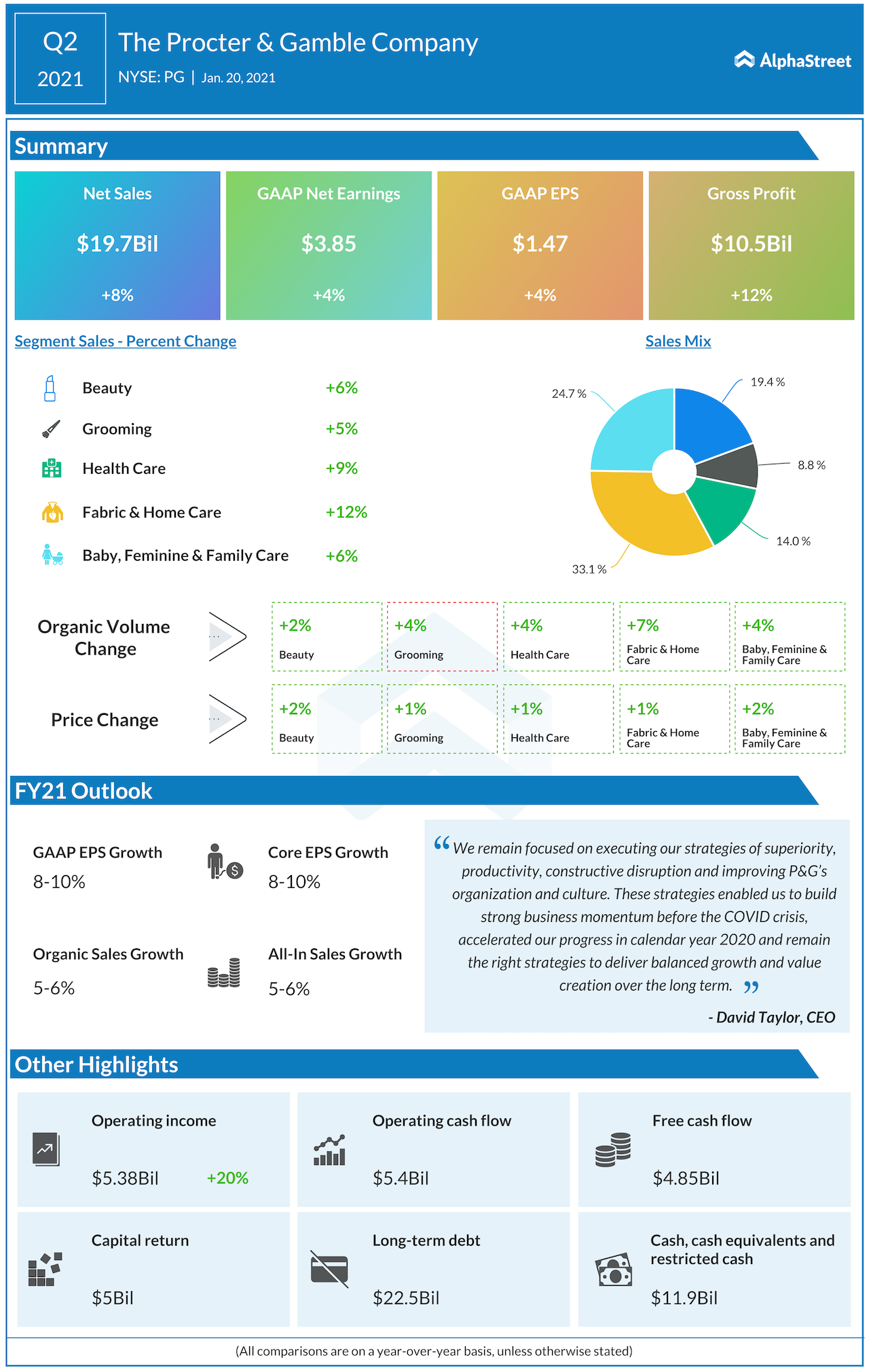 During the quarter, P&G delivered strong sales growth across all its segments with the Fabric & Home Care and Health Care divisions reporting the highest growth rates of 12% and 9% respectively, both on a reported and organic basis.