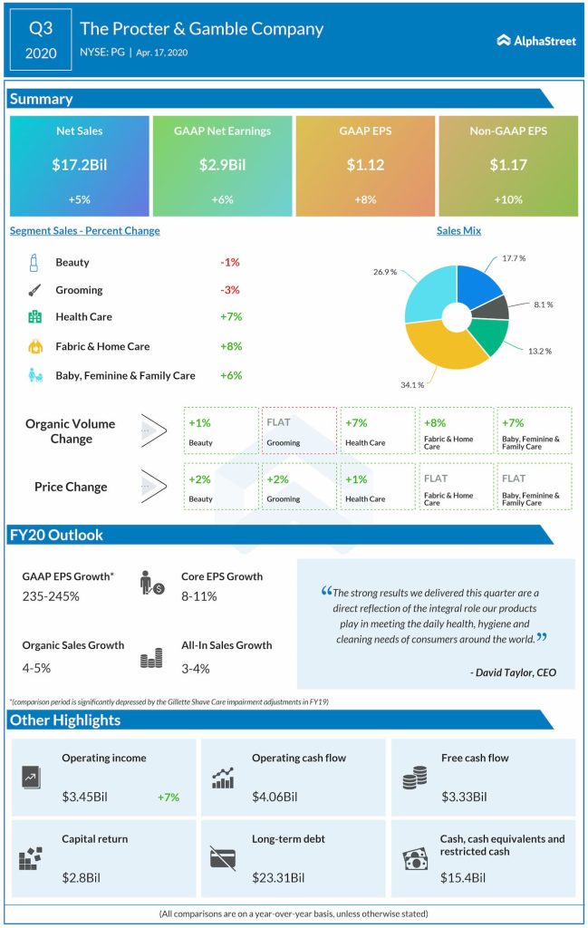 The company adjusted its outlook for fiscal 2020 all-in sales growth, from a range of 4-5% growth to a range of 3-4% growth, to reflect stronger headwinds from foreign exchange. The guidance for organic sales growth was maintained in the range of 4-5% and for all-in GAAP EPS growth at 235-245%. The core EPS growth outlook is maintained at 8-11%. The company expects to pay over $7.5 billion in dividends and repurchase $7-8 billion of common shares in fiscal 2020.