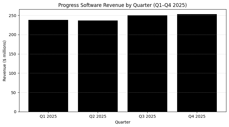 Progress reported fiscal Q4 2025 revenue of about $252.7 million, an 18% increase year-over-year, slightly under the average analyst revenue estimate but still showing solid expansion in key recurring channels. Adjusted earnings per share came in at $1.51, above consensus forecasts of $1.31 and prior guidance. Annualized Recurring Revenue (ARR) rose to roughly $852 million, up modestly from the prior year, while net retention remained at 100%. Operating margin improved, and non-GAAP operating margin held robustly near 38% in the quarter.