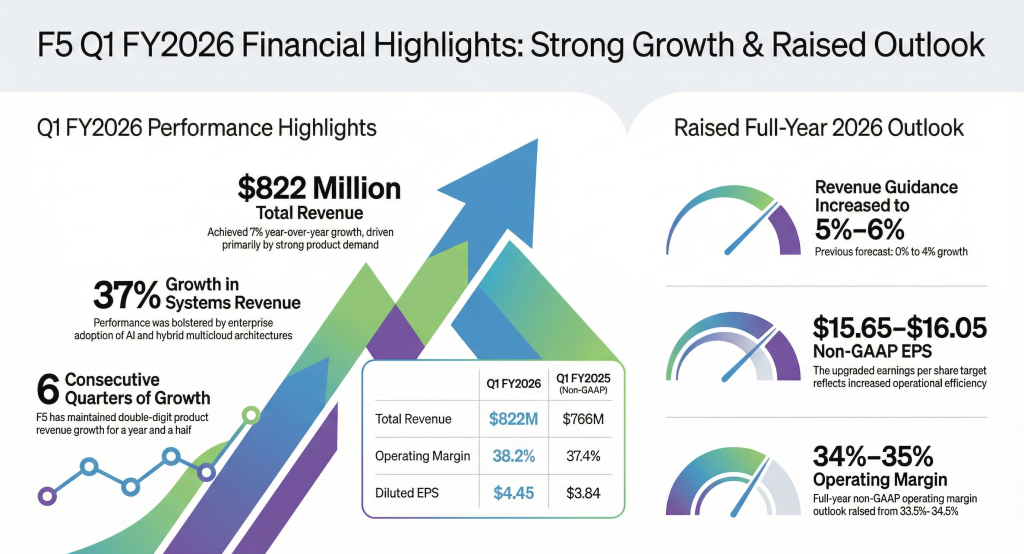 For the first quarter ended December 31, 2025, F5 reported consolidated revenue of $822 million, a 7% increase from $766 million in the year-ago period. GAAP net income reached $180 million, up 8.4% from $166 million in Q1 FY2025.