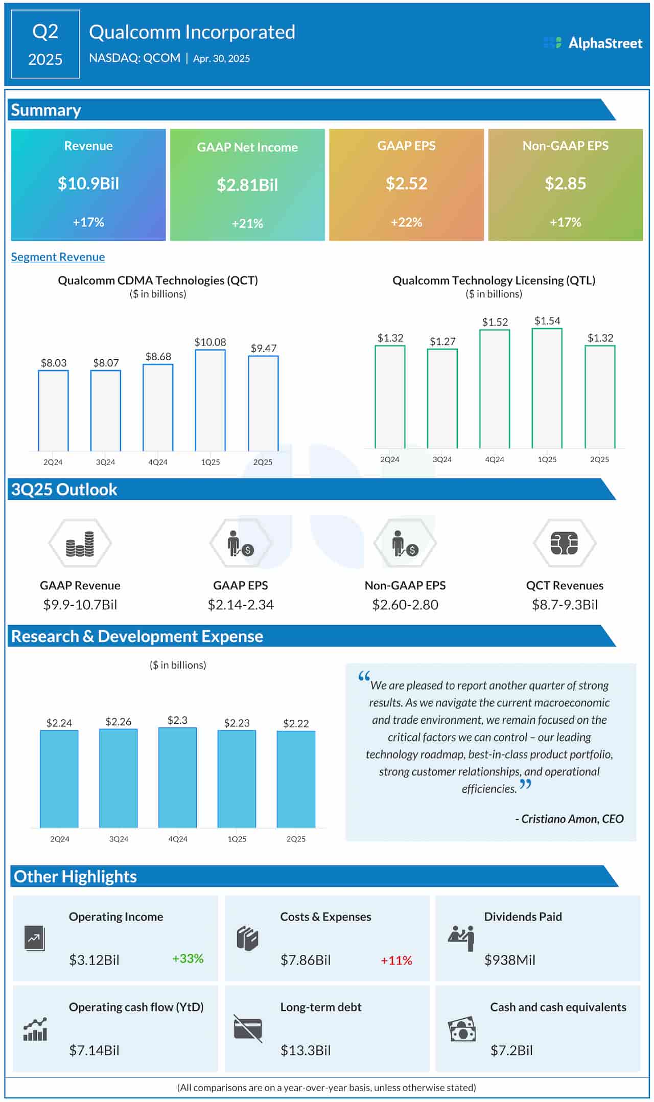 Second-quarter revenues increased to $11.0 billion from $9.39 billion last year. Revenue from the CDMA Technologies division grew 18% while Technology Licensing revenue remained unchanged YoY.