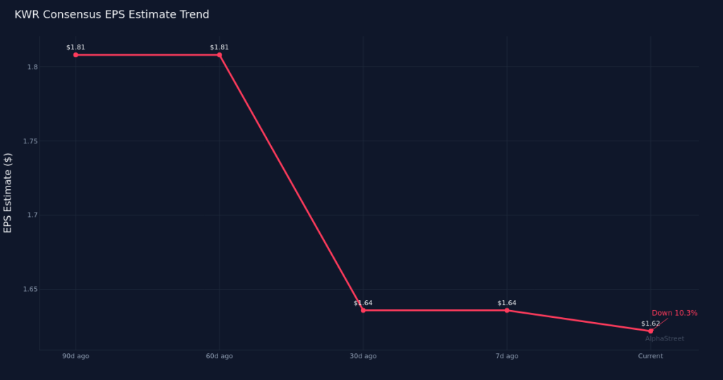 Growth Deceleration Narrative. The implied 2.5% year-over-year EPS growth stands in stark contrast to the double-digit downward estimate revisions over the past ninety days. This disconnect highlights how much more optimistic the Street was just three months ago about Quaker’s earnings power. Understanding what changed—whether end-market demand, customer inventory management, competitive pricing, or cost inflation—will be critical to assessing whether current expectations are appropriately calibrated or if further reset is needed.