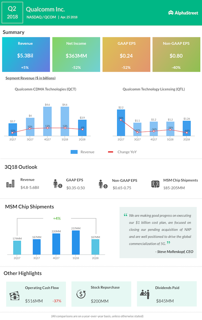 Qualcomm shares rose around 2% in the aftermarket after it reported better-than-expected earnings results in the second quarter of 2018. Revenue for the quarter witnessed a modest growth of 5% to $5.3 billion.