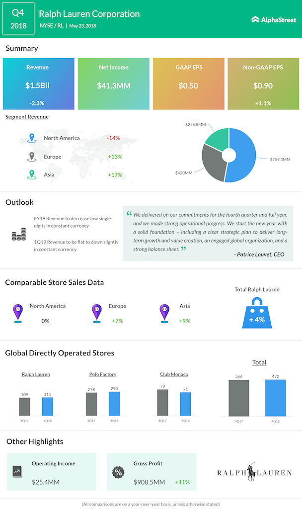 Premium lifestyle products manufacturer Ralph Lauren (RL), which was trounced by a year-over-year trend of declining revenue for more than three years, continued the same trend in the recently ended fourth quarter with a 2.3% decline in revenue at $1.52 billion. The New York-based retailer attributed the sales dip to declining consumer demand and lower level of promotional activity along with distribution and brand exits.