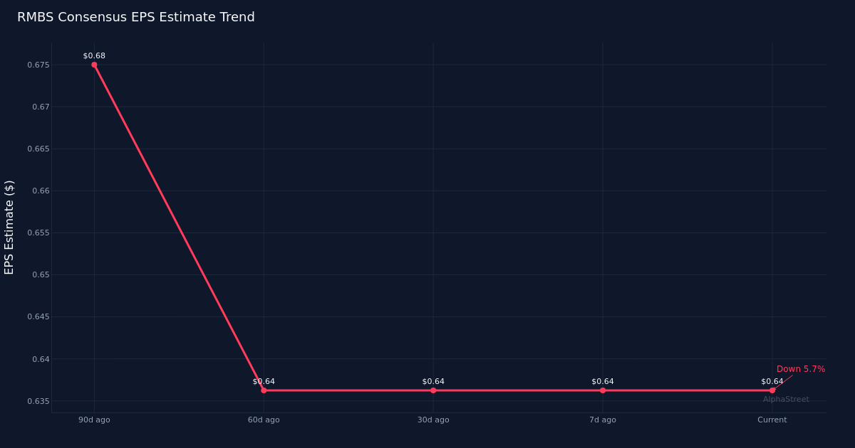 Wall Street is targeting earnings of $0.64 per share on revenue of $179.9M when Rambus Inc. reports first-quarter results on April 27. Eight analysts covering the semiconductor company have set estimates ranging from $0.60 to $0.68 per share on the bottom line, while revenue projections span $175.0M to $184.0M. The consensus marks another quarter of expected growth for the memory interface and security IP provider as it navigates the evolving semiconductor landscape.