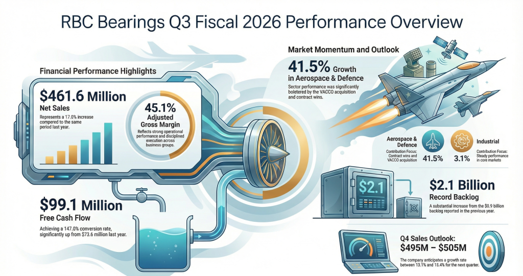 RBC Bearings reported net sales of $461.6 million for the third quarter of fiscal 2026, an increase of 17.0% year-over-year. Aerospace/Defense unit sales rose about 41.5%, while Industrial segment sales grew roughly 3.1%.