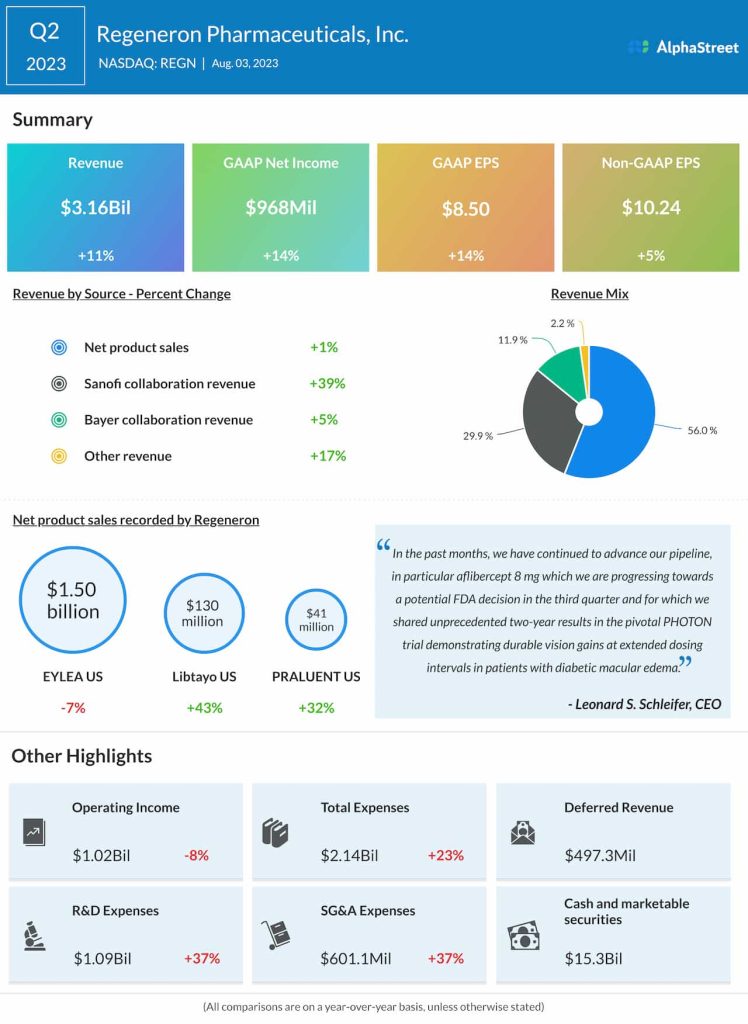 Healthcare firm Regeneron Pharmaceuticals, Inc. (NASDAQ: REGN) on Thursday reported an increase in adjusted earnings and revenues for the second quarter of 2023.