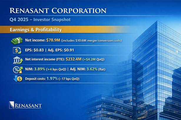 Net income totaled $78.9 million, including $10.6 million in merger and conversion expenses. Diluted EPS was $0.83, while adjusted diluted EPS (non-GAAP) was $0.91. Net interest income (FTE) rose $4.2 million QoQ to $232.4 million. Net interest margin improved to 3.89%, up 4 bps QoQ; adjusted NIM remained flat at 3.62%. Cost of total deposits declined 17 bps QoQ to 1.97%, reflecting improved funding costs.