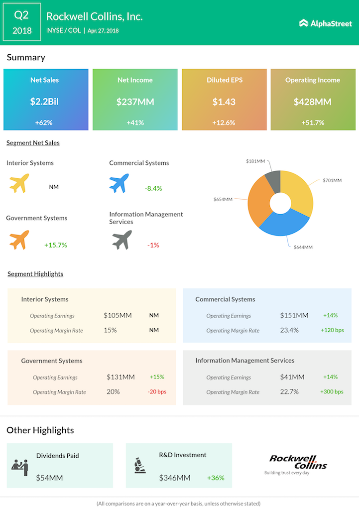 Avionics and aircraft parts maker Rockwell Collins (COL) beat profit and sales expectations in the second quarter 2018, bolstered by strong revenue stream from the recently acquired B/E Aerospace. Throughout the day the stock was trading in the negative territory despite the strong results.