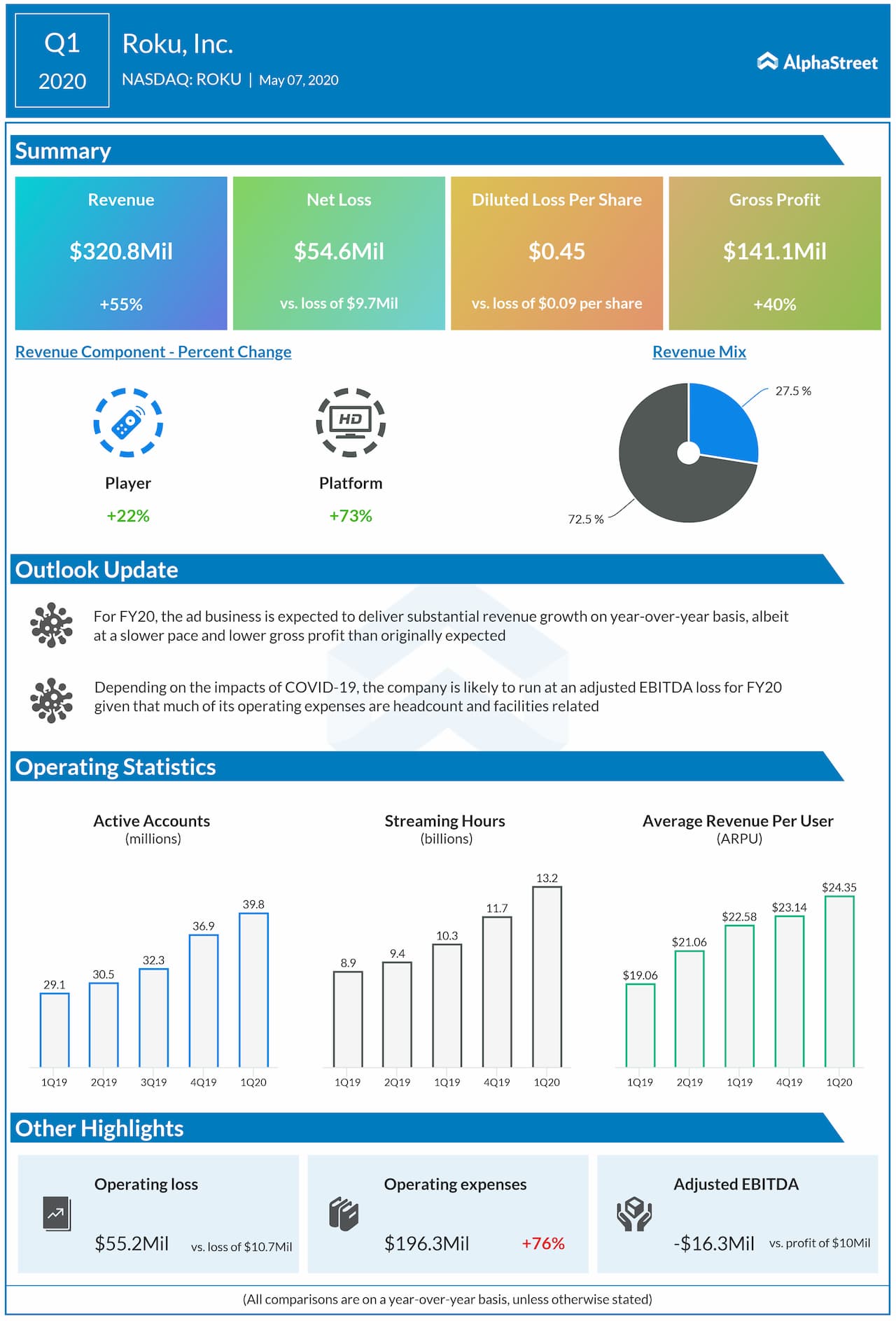 Roku, Inc. (NASDAQ: ROKU) reported a wider loss in the first quarter of 2020 due to higher costs and expenses. However, the top line rose by 55% on the acceleration in new account growth and an increase in viewing. Beginning in late Q1, Roku has started to see the effects of large numbers of people isolated at their homes due to the COVID-19 pandemic.