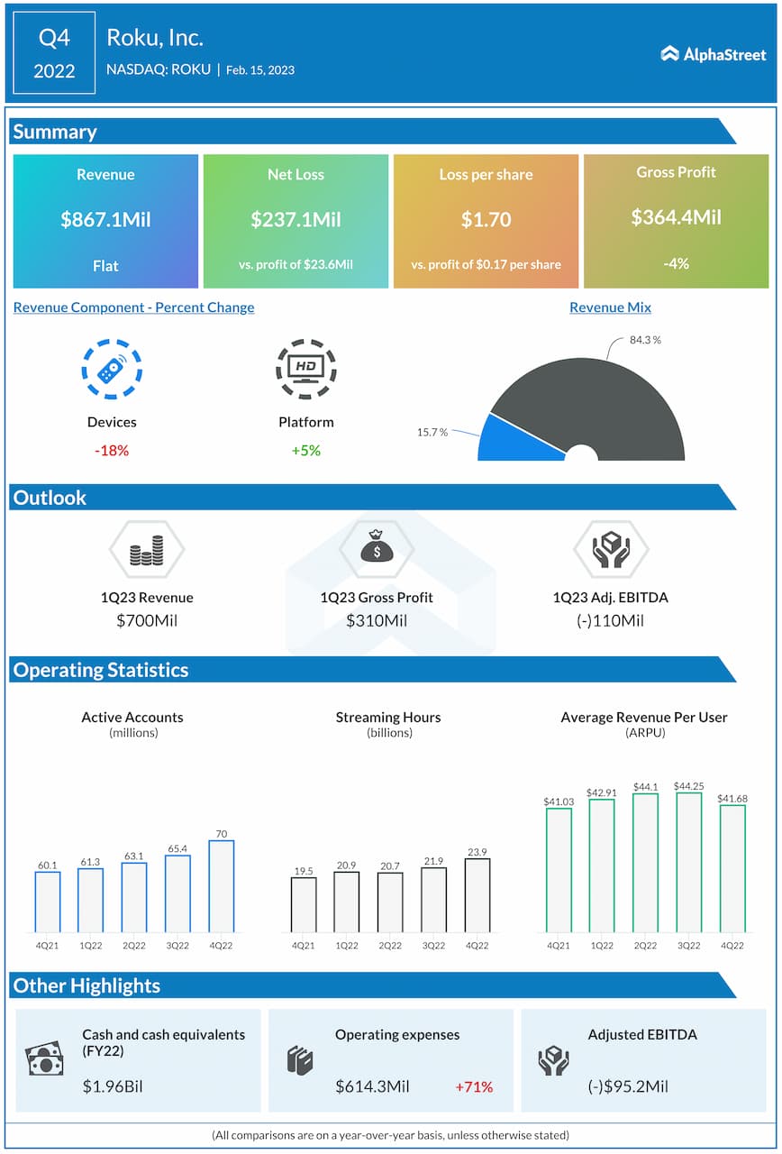 Roku, Inc. (NASDAQ: ROKU) reported total net revenue of $867.1 million for the fourth quarter of 2022, relatively flat compared to the same period a year ago.