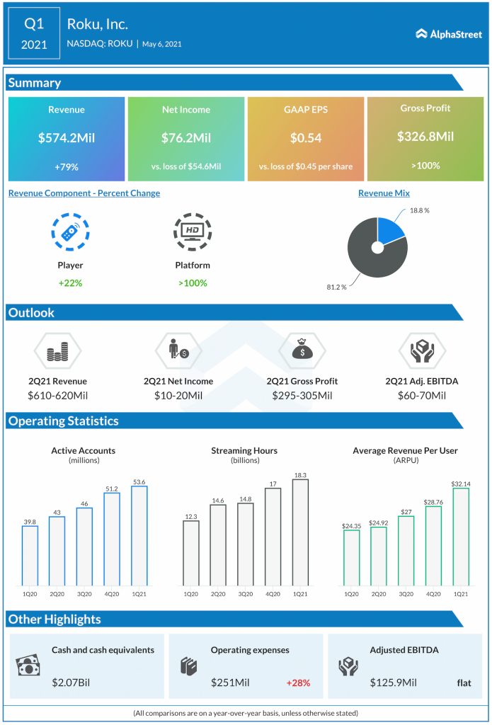 For the second quarter of 2021, total revenue is estimated to range between $610-620 million while net income is expected to come between $10-20 million. Roku expects more volatile comparisons for revenues going forward into the year as it laps the spikes seen during the COVID-19 pandemic period last year. Revenue growth rates are expected to be stronger during the first half of 2021 as comps get tougher during the latter half.