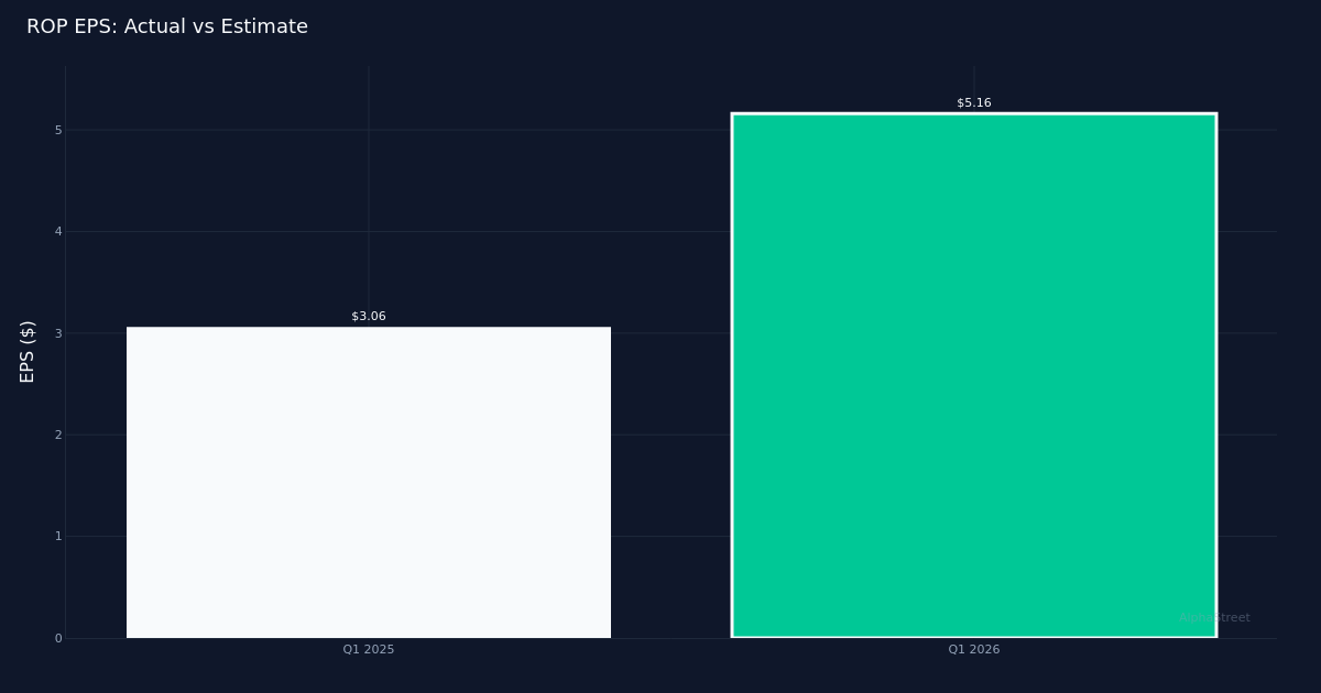Solid Beat. Roper Technologies, Inc. (NASDAQ:ROP) delivered Q1 2026 adjusted earnings of $5.16 per share, beating the $4.99 consensus estimate by 3.4% based on estimates from 17 analysts. Revenue of $2.10B exceeded Wall Street’s $2.06B forecast by 1.5%, representing an 11.0% increase from $1.88B in Q1 2025. The stock traded largely unchanged following the report, suggesting investors had anticipated the modest outperformance or remain cautious on valuation despite the growth trajectory.