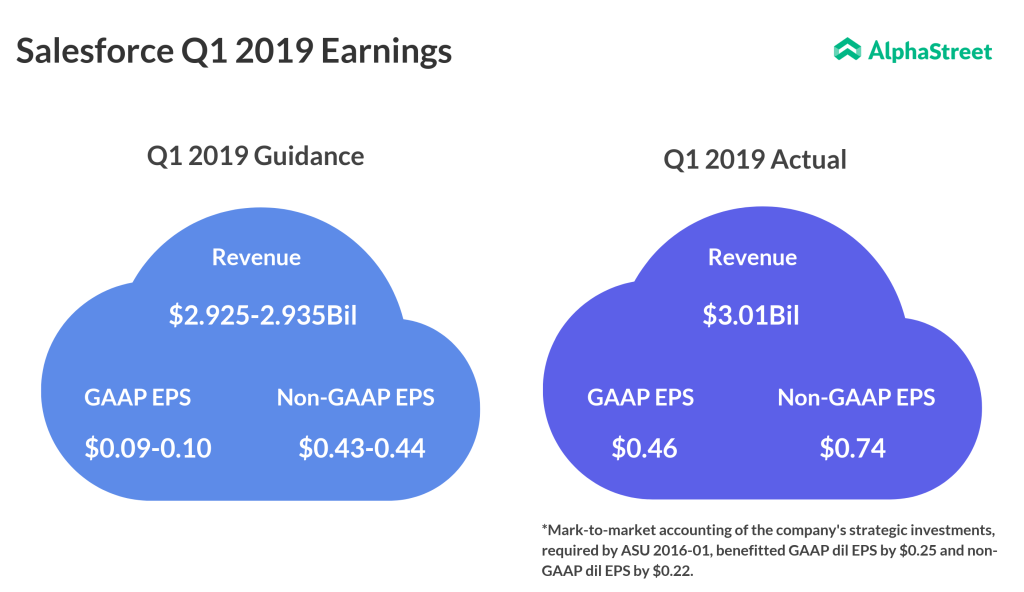 Salesforce raised its revenue guidance for FY19 to a range of $13.075 billion to $13.125 billion, while for Q2 2019, revenue is expected to come in the range of $3.22 billion to $3.23 billion. The current quarter GAAP earnings per share is expected to be in the negative territory of ($0.09) – ($0.08) and for the year it is expected to come in the range of $0.49 to $0.51. On an adjusted basis, the company expects earnings per share to be in the range of $0.46 to $0.47.