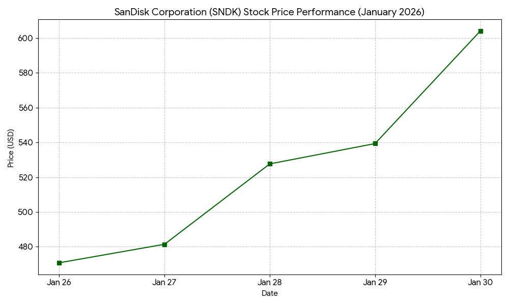 Sandisk Corporation (NASDAQ: SNDK) shares rose by 12.00 percent in intraday trading following the release of the company’s fiscal second quarter financial results. The stock movement reflects investor response to the earnings report issued on January 29, 2026. The market capitalization of Sandisk Corporation stands at approximately $79.04 billion as of today’s market session.