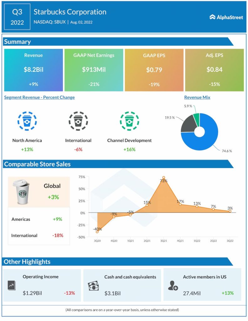 Net earnings attributable to Starbucks decreased 21% to $913 million while EPS dropped 18.6% to $0.79. Adjusted EPS was $0.84.