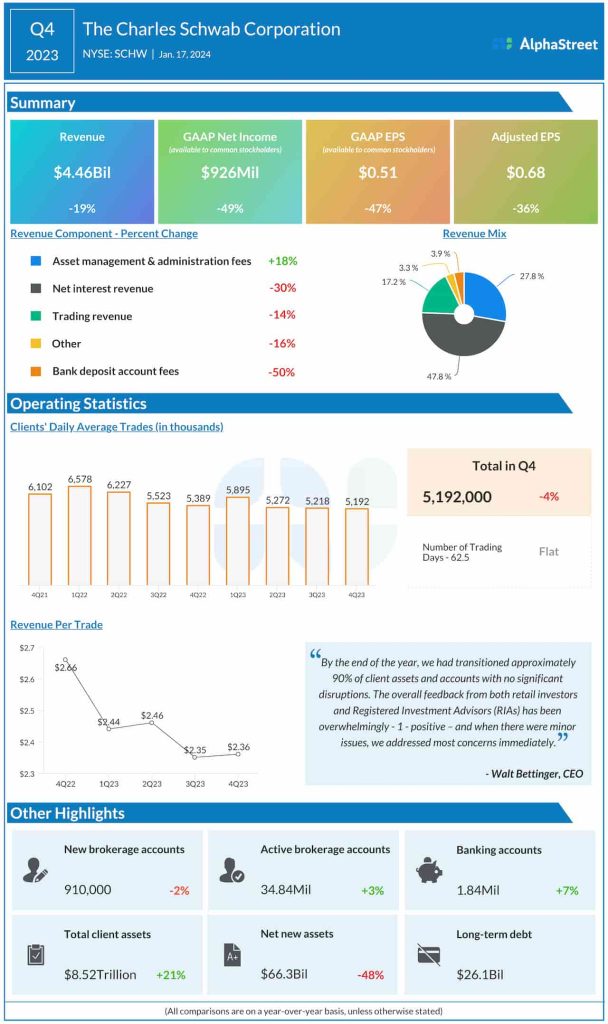 Total revenues declined 19% year-over-year to $4.46 billion in the fourth quarter. In the whole of 2023, clients entrusted the company with $306 billion in core net new assets, including over $43 billion in December alone.