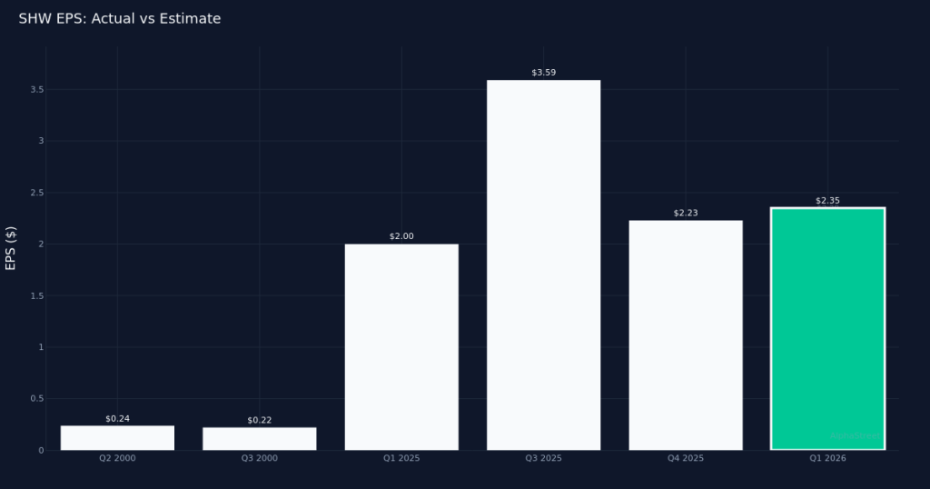 The Sherwin-Williams Company reported first-quarter results that topped Wall Street expectations, with adjusted earnings of $2.35 per share surpassing analysts’ $2.28 forecast by 3.1%. The Cleveland-based paint and coatings manufacturer generated $5.67B in revenue for the quarter, up 6.8% from $5.31B in Q1 2025. Net income reached $534.7M for the quarter.