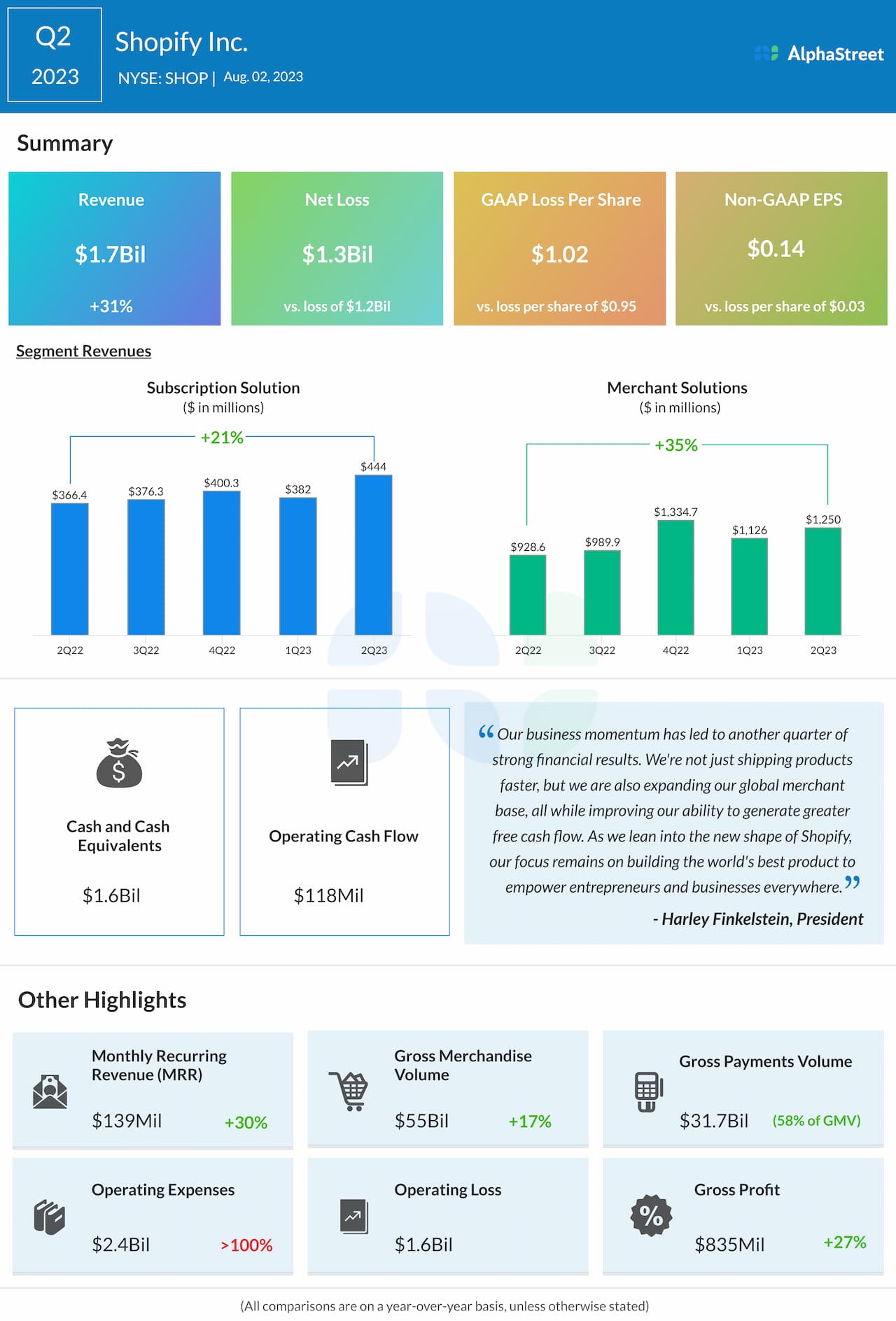 Shopify Inc. (NYSE: SHOP) reported total revenue of $1.7 billion for the second quarter of 2023, which was up 31% year-over-year.