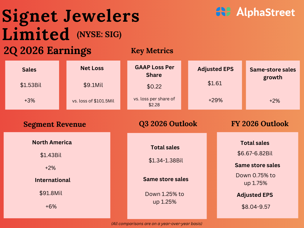 Signet saw growth in sales and earnings in the second quarter of 2026. Total sales increased 3% year-over-year to $1.53 billion, helped by growth in the fashion and services categories. Earnings per share, on an adjusted basis, grew 29% to $1.61 versus last year.