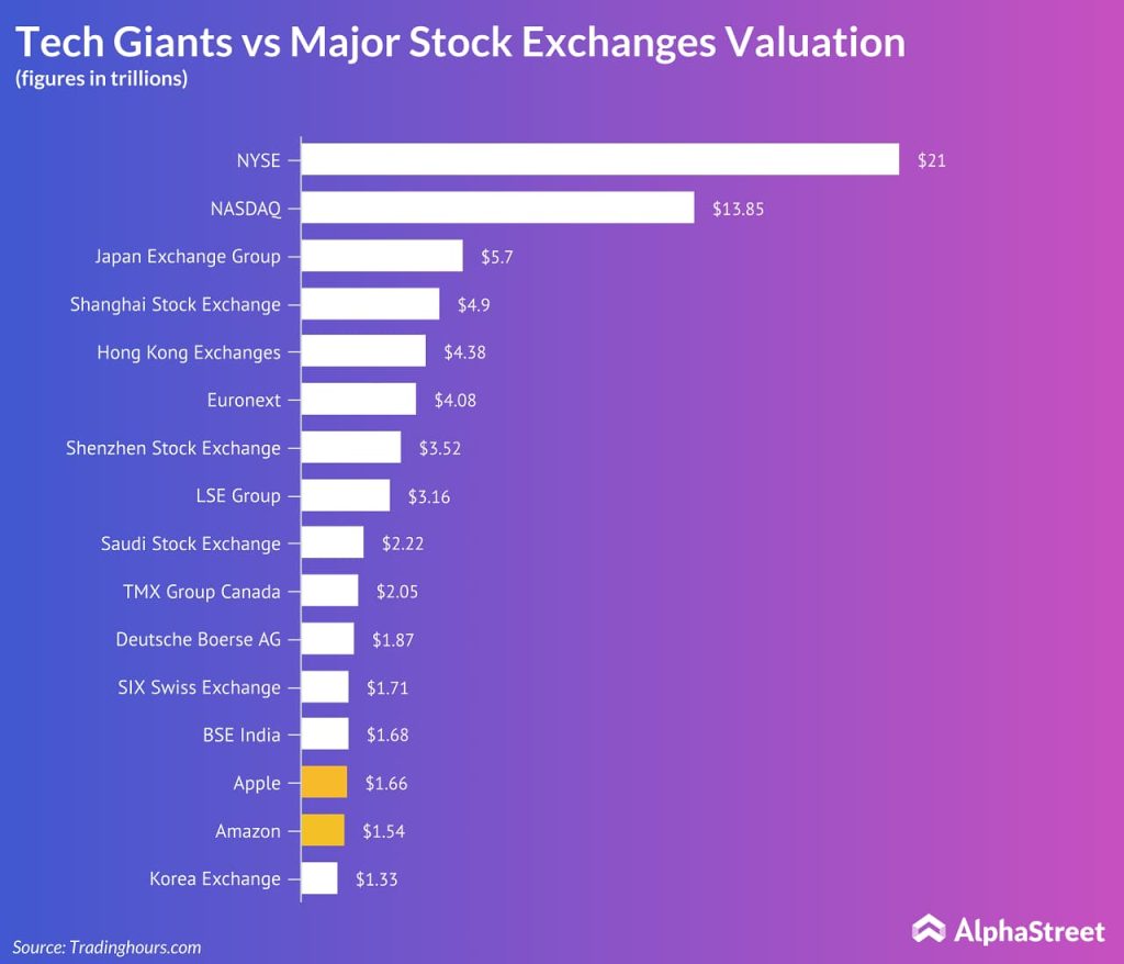 The tech heavyweights have also surpassed the valuation of the Australian Stock Exchange (valued at $1.26 trillion) and the Taiwan Stock exchange (valued at $1.11 trillion) and closely trailing India’s Bombay Stock Exchange (BSE).